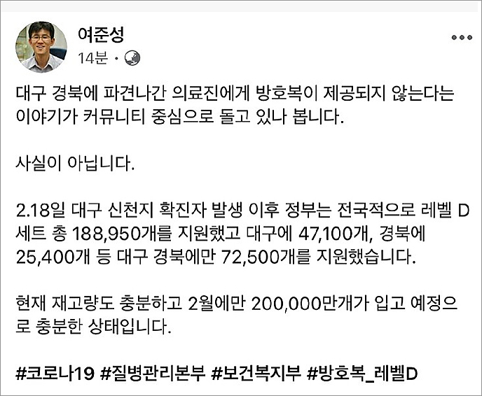 정부의 공식 설명은 딴판이다. 중앙사고 수습본부 부 본부장인 김강립 보건복지부 차관은 28일 브리핑에서 "현지 요청에 따라 대구 의료진에게 전신 방호복 약 4만 7000개, 마스크 7만 7000개를 보냈다"라고 했다. 현장에서 방호복이 모자랄 리가 없다는 투다. 방역 당국에 따르면, 지난 18일 대구에서 신천지 확진자 발생 후 정부는 전국적으로 전신 방호복 총 19만 개를 지원했다. 또 이달 안에 20만 개를 추가로 보낼 예정이다.