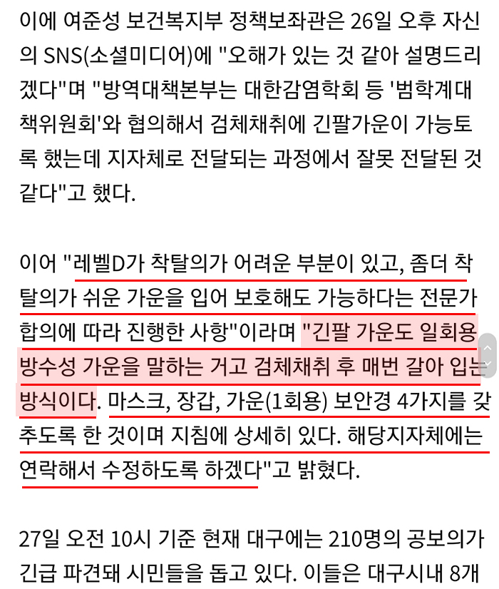 정부 비판을 위해 '가운(실제는 방수성 가운)을 입으라는 지침'을 가져와 "방호복이 부족하니 이런 고육지책까지 나왔다"라는 사족을 달아 정부를 비판한 것이 아닌가 합리적 생각이 드는 것이 무리 아니지 않을까? 늘 그렇듯 일부 내용만 발취해서 왜곡 되어진 기사가 얼마나 많이 쓰이는지는 알 사람은 다 알 것이다.